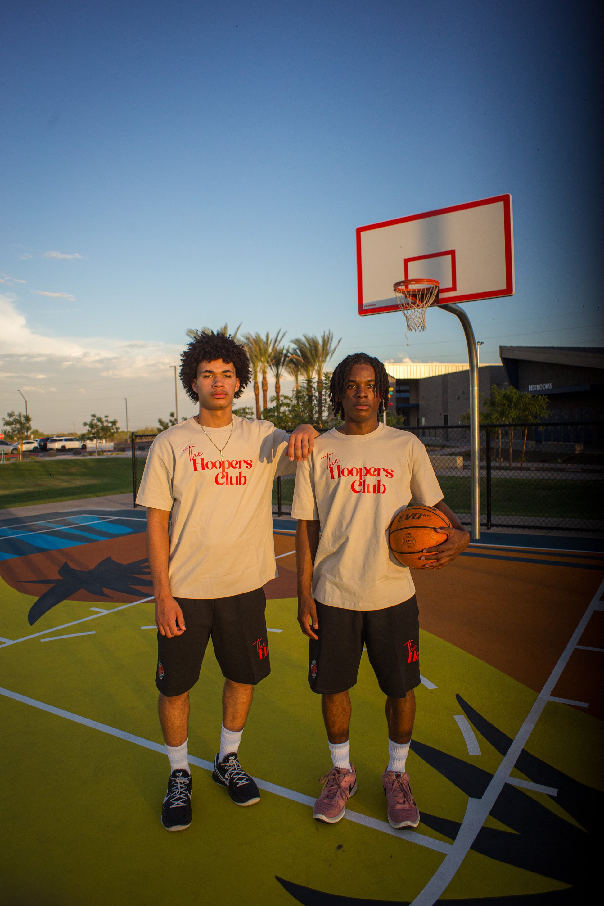 100% cotton 7.5oz heavyweight tee. Dust color with red hoopers club logo on the front. Hoopers club verified stamp logo on the back